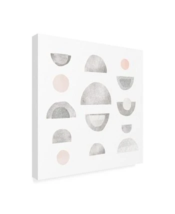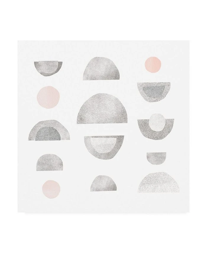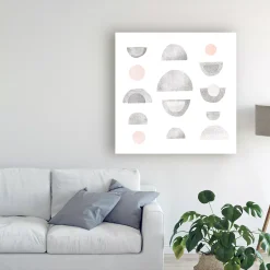 This ready to hang, gallery-wrapped art piece features pink and gray spots of paint over a white background. Gallery-wrap is a method of wrapping an artist’s canvas around a hidden, wooden frame allowing for a frameless presentation.