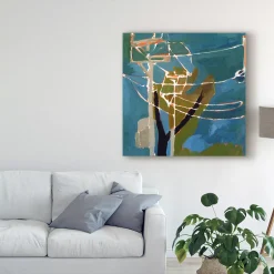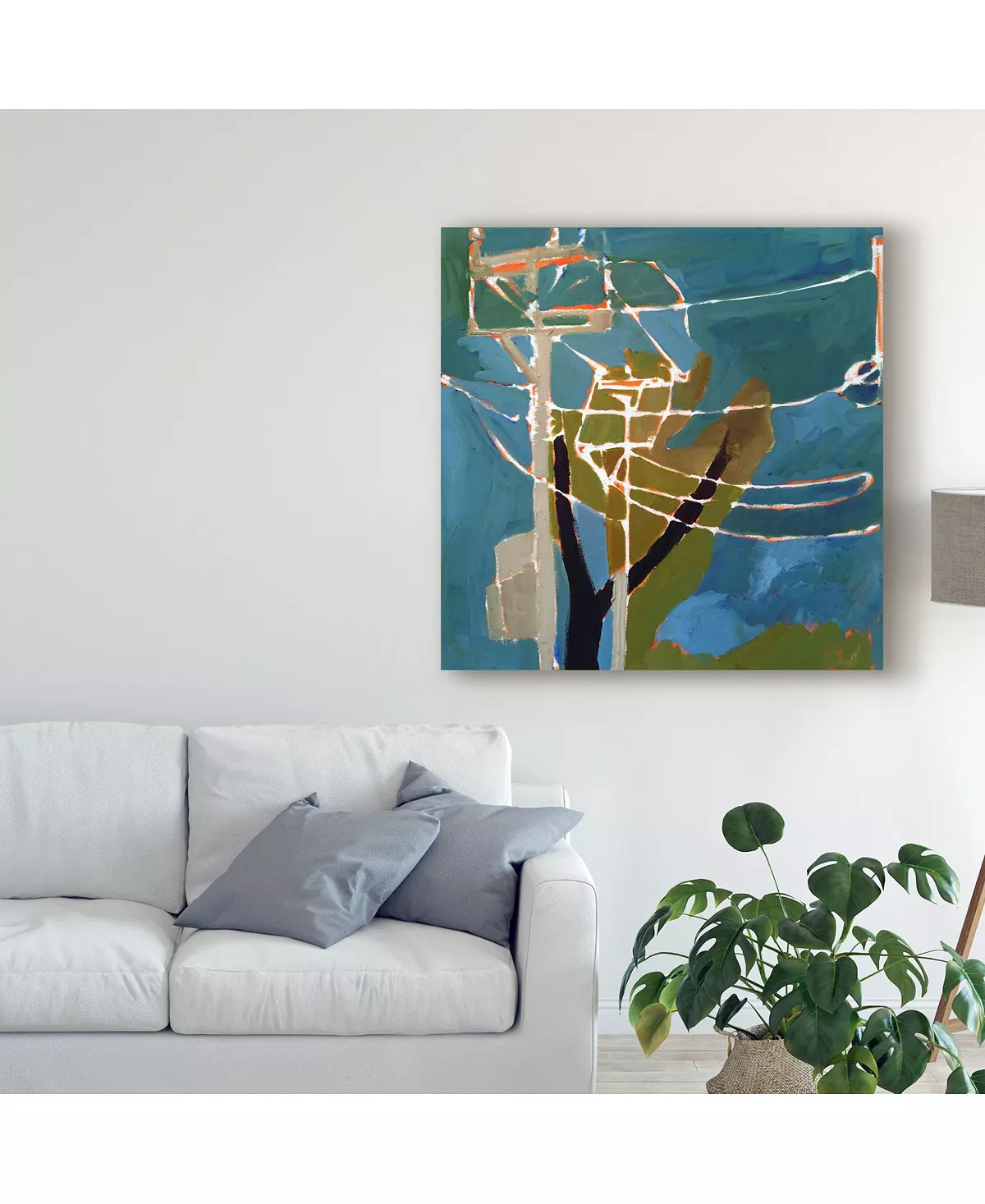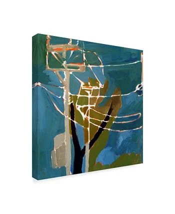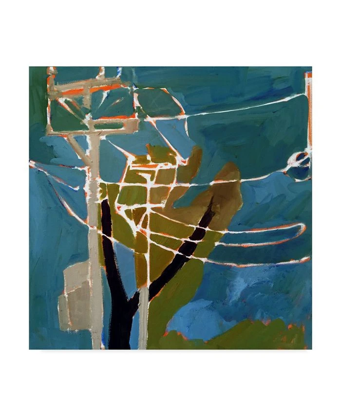 This ready to hang, gallery-wrapped art piece features abstract telephone poles over colorful bold background. Gallery-wrap is a method of wrapping an artist’s canvas around a hidden, wooden frame allowing for a frameless presentation.