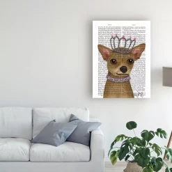 This ready to hang, gallery-wrapped art piece features a portrait of a dog dressed up over a book page. Gallery-wrap is a method of wrapping an artist’s canvas around a hidden, wooden frame allowing for a frameless presentation.