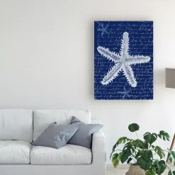 This ready to hang, gallery-wrapped art piece features a white starfish in the center of the frame. Gallery-wrap is a method of wrapping an artist’s canvas around a hidden, wooden frame allowing for a frameless presentation.