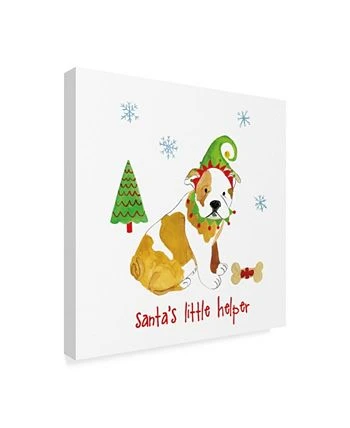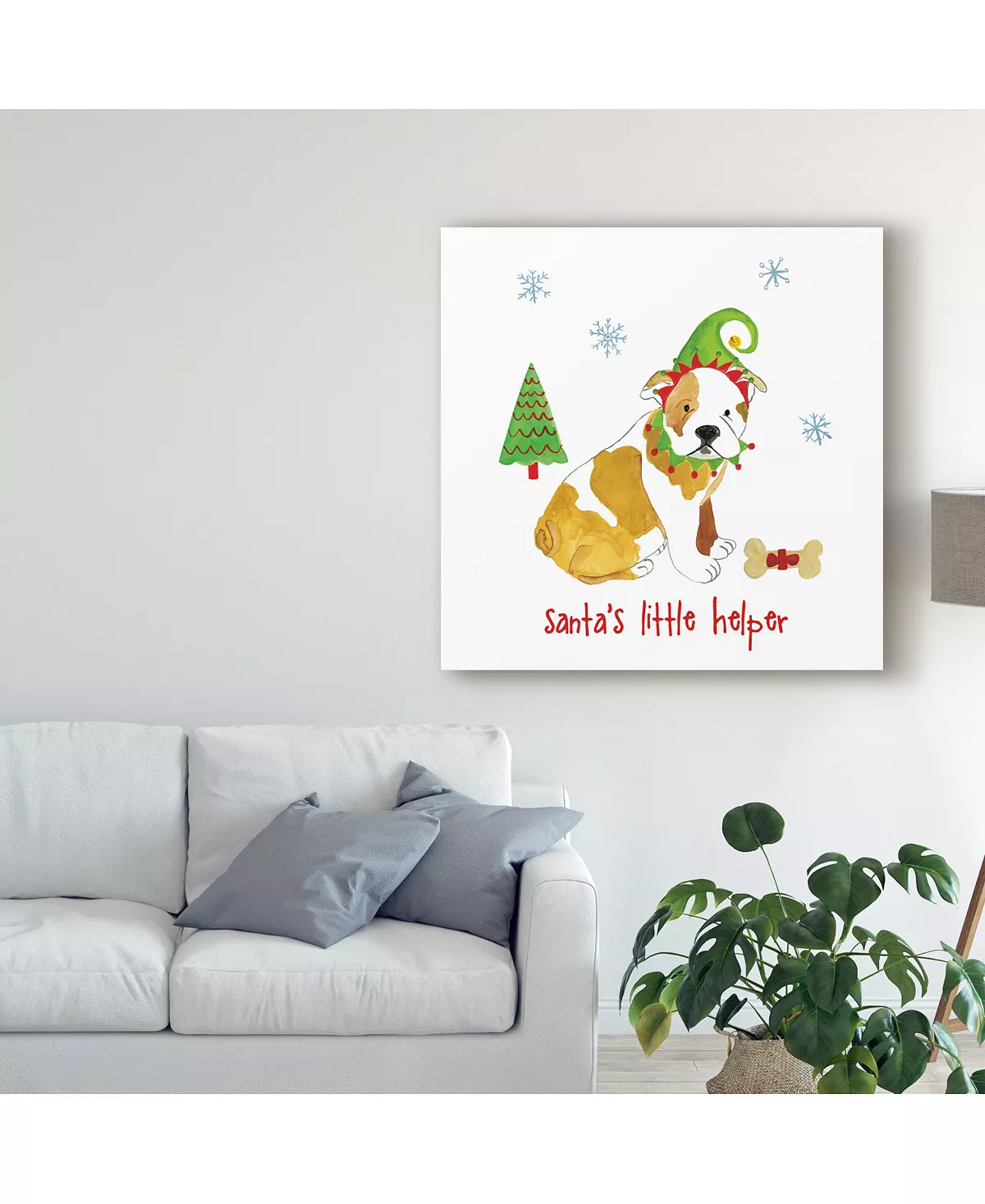 This ready to hang, gallery-wrapped art piece features the words “Santa’s little helper” beneath a bulldog in a red and green jester’s hat. This art is gallery-wrapped, which allows for a frameless presentation.