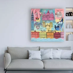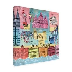 This ready to hang, gallery-wrapped art piece features a colorful collage of landmark images of Venice. Gallery-wrap is a method of wrapping an artist’s canvas around a hidden, wooden frame allowing for a frameless presentation.