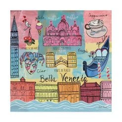 This ready to hang, gallery-wrapped art piece features a colorful collage of landmark images of Venice. Gallery-wrap is a method of wrapping an artist’s canvas around a hidden, wooden frame allowing for a frameless presentation.