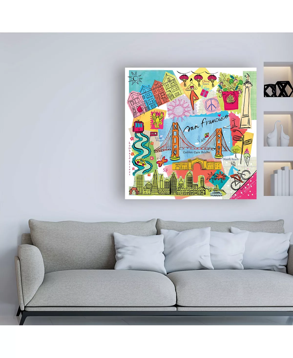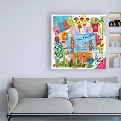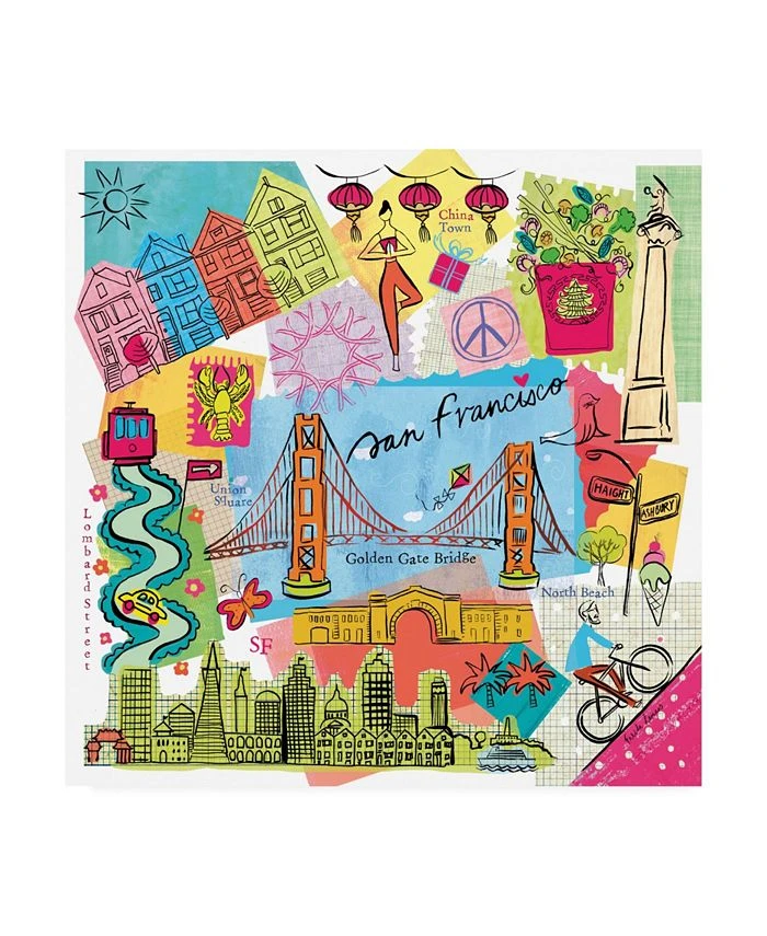 This ready to hang, gallery-wrapped art piece features a colorful collage of landmark images of San Francisco. Gallery-wrap is a method of wrapping an artist’s canvas around a hidden, wooden frame allowing for a frameless presentation.