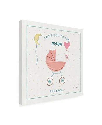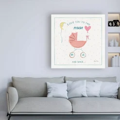 This ready to hang, gallery-wrapped art piece features a phrase for a nursery and a pink baby buggy. Gallery-wrap is a method of wrapping an artist’s canvas around a hidden, wooden frame allowing for a frameless presentation.
