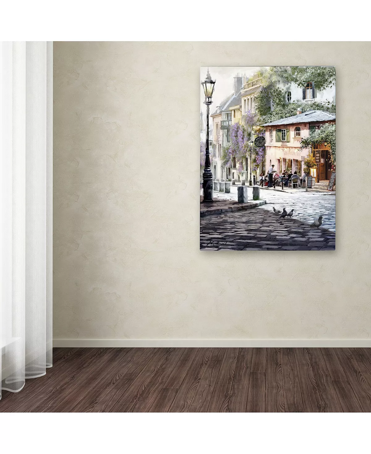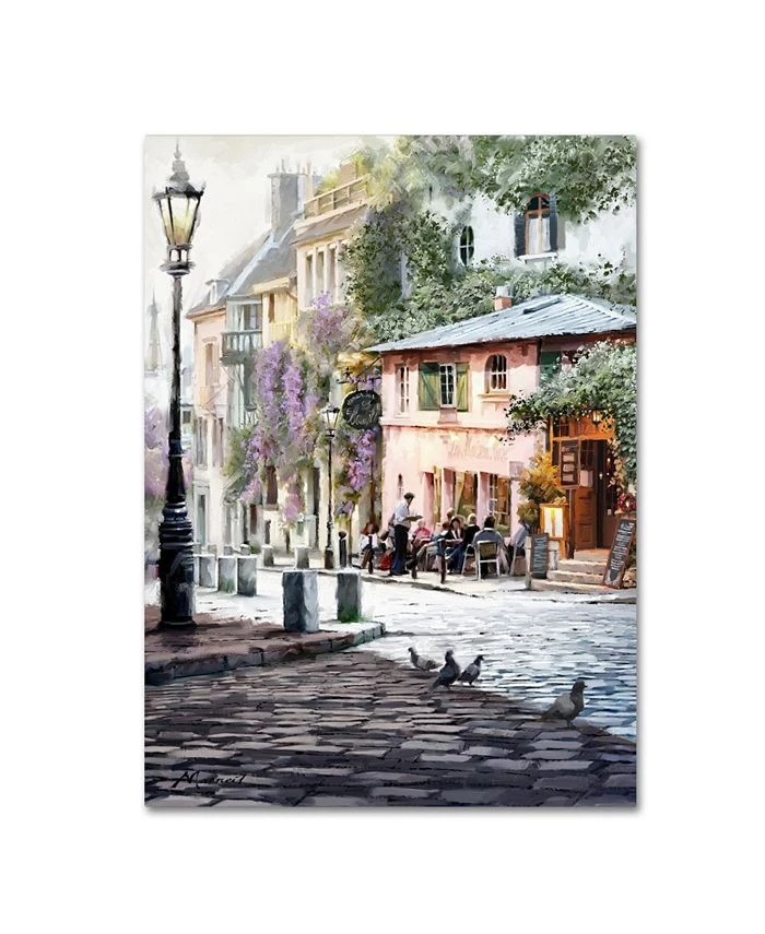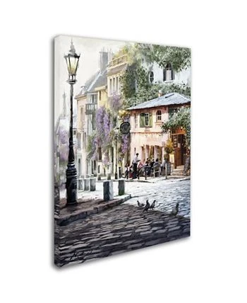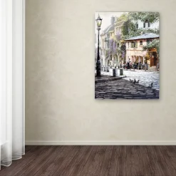 This ready to hang, gallery-wrapped art piece features a buildings covered with flowers and ivy along a cobblestone street. Gallery wrap is a method of stretching an artist’s canvas so that the canvas wraps around the sides and is secured a hidden, wooden frame this allows for a frameless presentation of the finished painting.