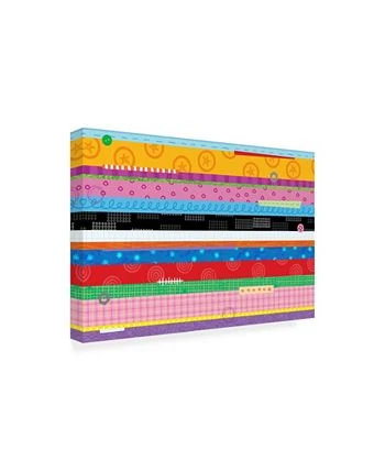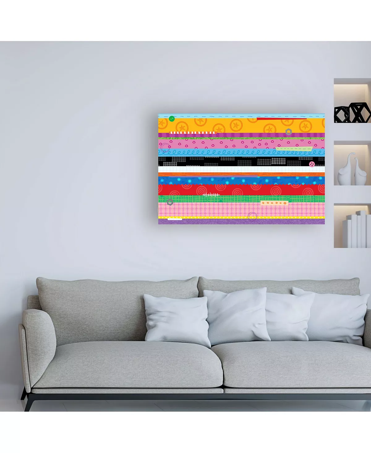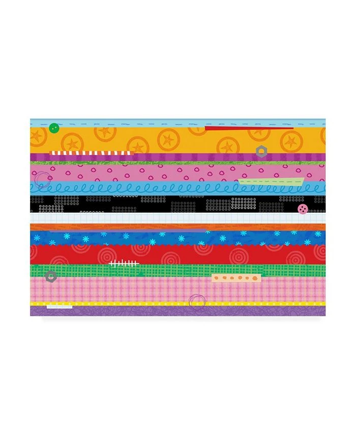 This ready to hang, gallery-wrapped art piece features a striped pattern in baby material prints with buttons. Gallery-wrap is a method of wrapping an artist’s canvas around a hidden, wooden frame allowing for a frameless presentation.