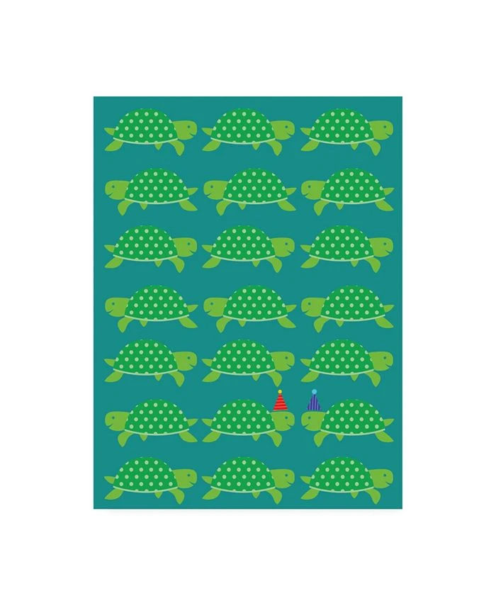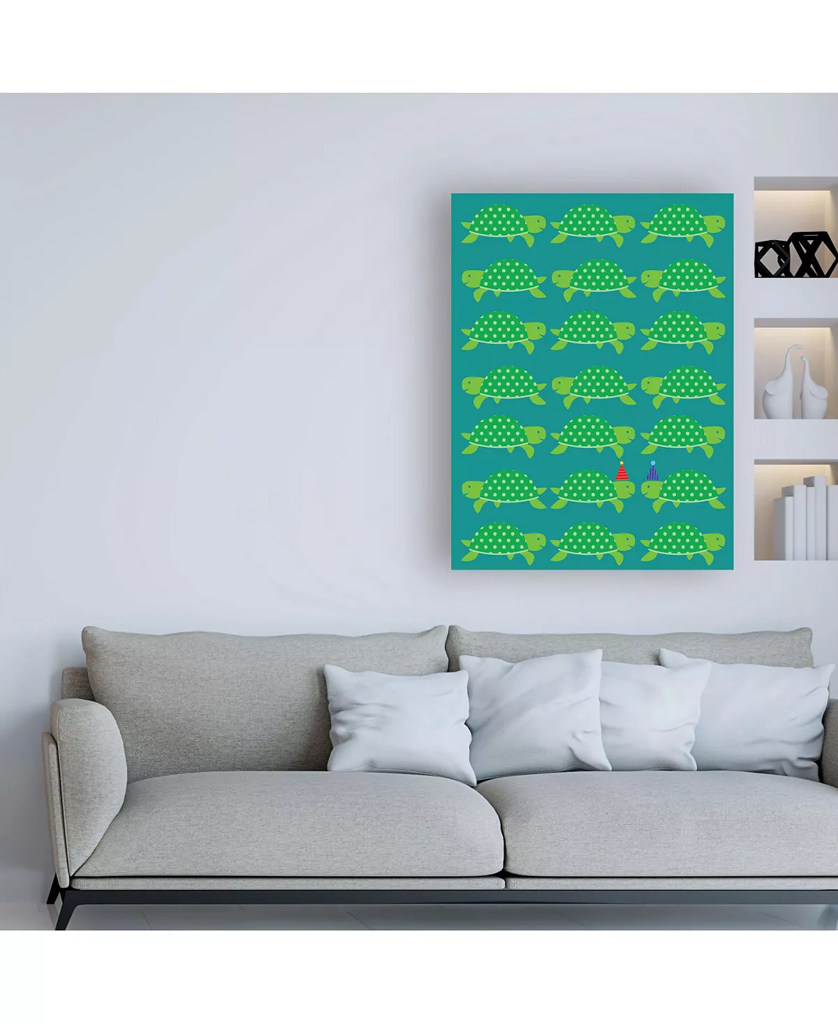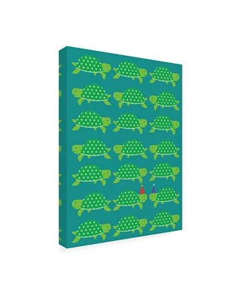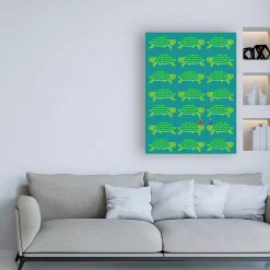 This ready to hang, gallery-wrapped art piece features patterned rows of green turtles on a blue background. Gallery-wrap is a method of wrapping an artist’s canvas around a hidden, wooden frame allowing for a frameless presentation.