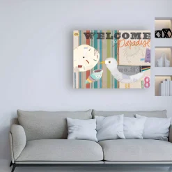 This ready to hang, gallery-wrapped art piece features “welcome to paradise” text with an abstract image of a seagull and shells. Gallery-wrap is a method of wrapping an artist’s canvas around a hidden, wooden frame allowing for a frameless presentation.