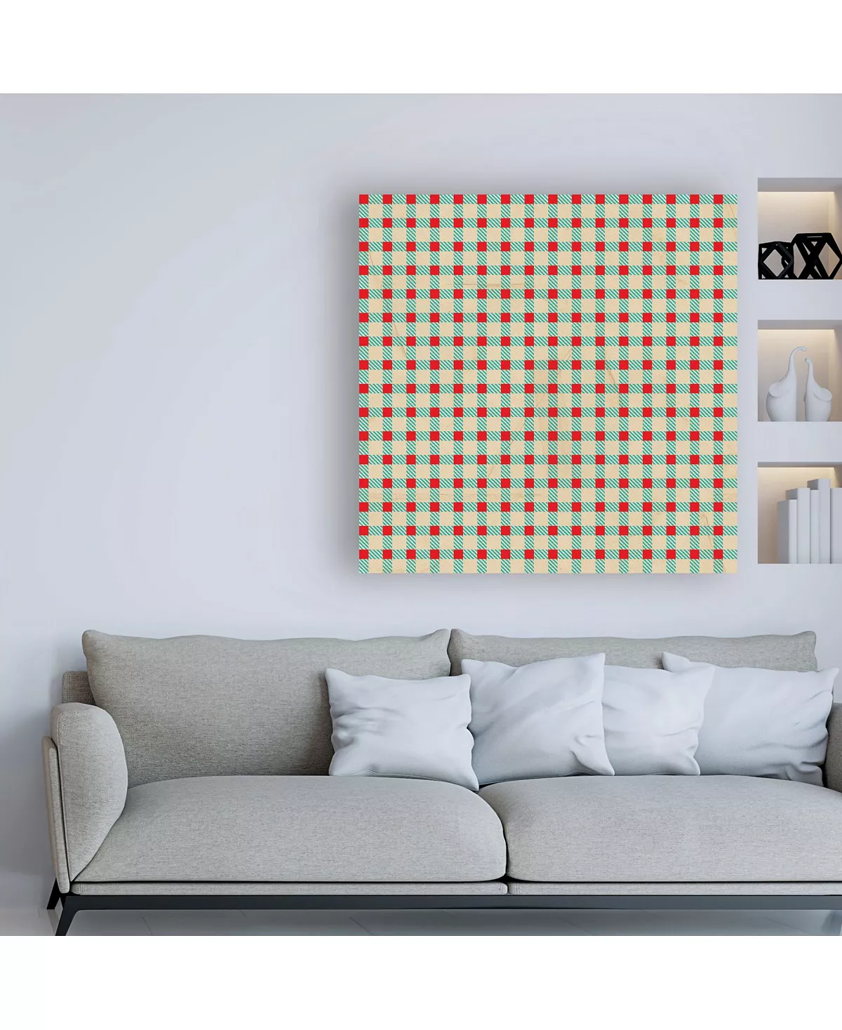 This ready to hang, gallery-wrapped art piece features a vintage, retro, holiday patterned design in red and green. Gallery-wrap is a method of wrapping an artist’s canvas around a hidden, wooden frame allowing for a frameless presentation.