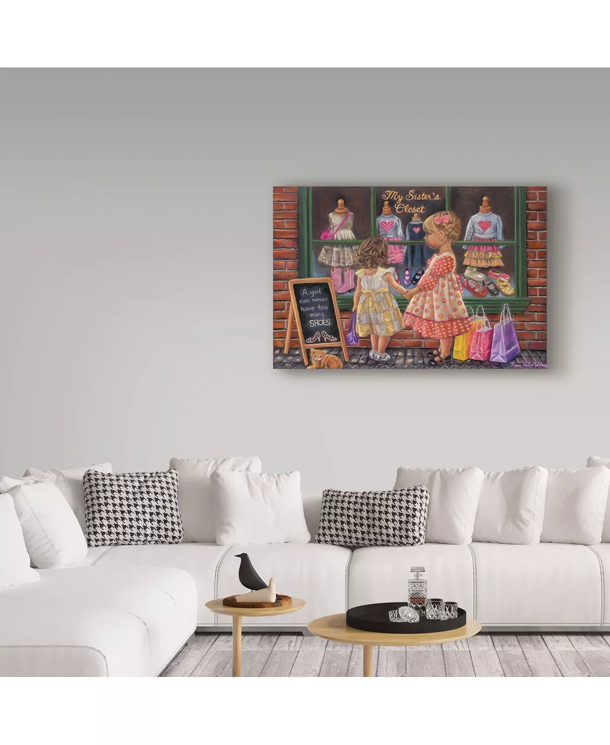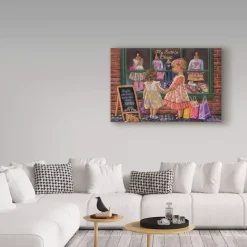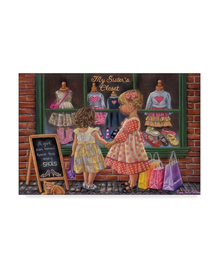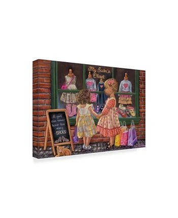 This ready to hang, gallery-wrapped art piece features two girls looking at clothes in a window. Gallery wrap is a method of stretching an artist’s canvas so that the canvas wraps around the sides and is secured a hidden, wooden frame this allows for a frameless presentation of the finished painting.