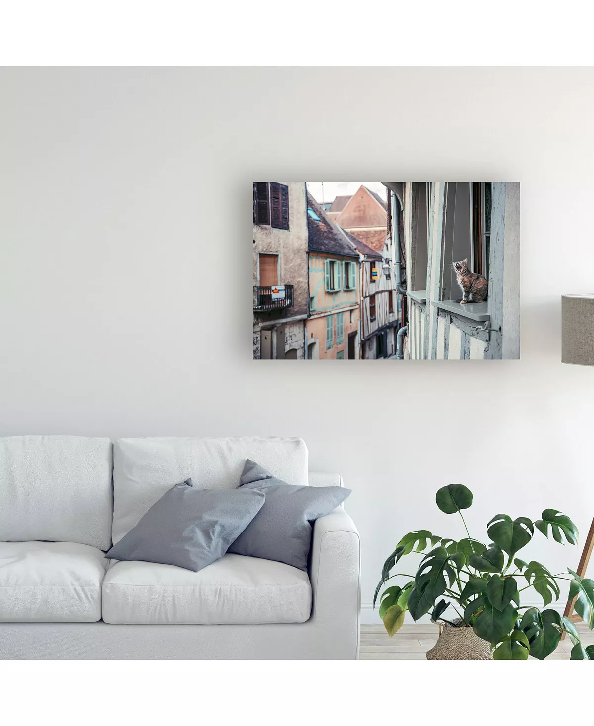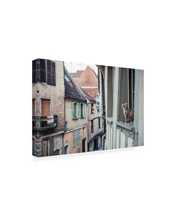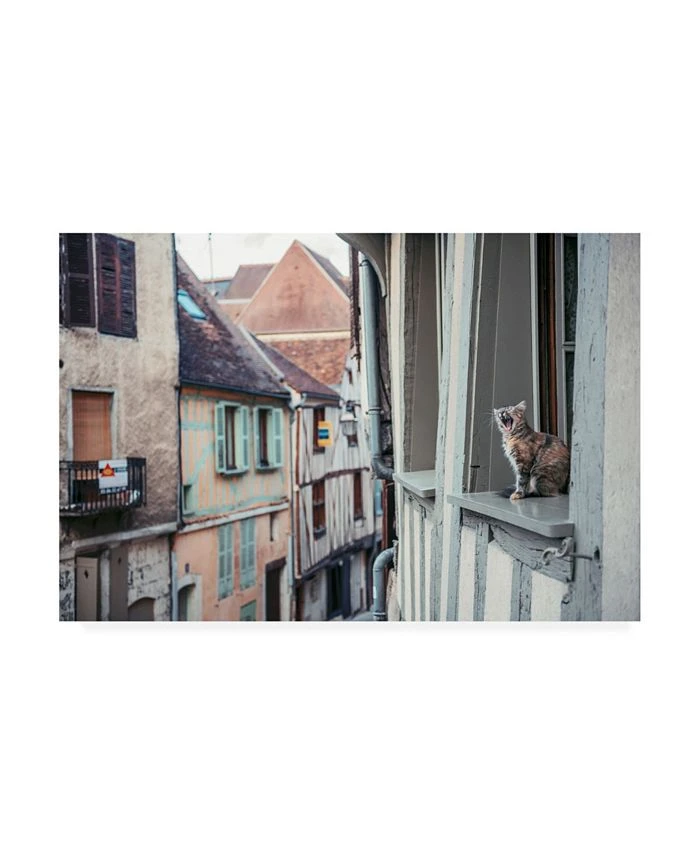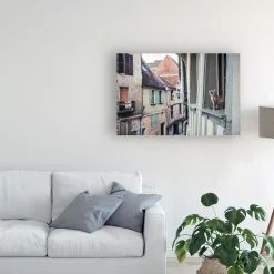 This ready to hang, gallery-wrapped art piece features a cat sitting in a window in a cityscape. Gallery-wrap is a method of wrapping an artist’s canvas around a hidden, wooden frame allowing for a frameless presentation.