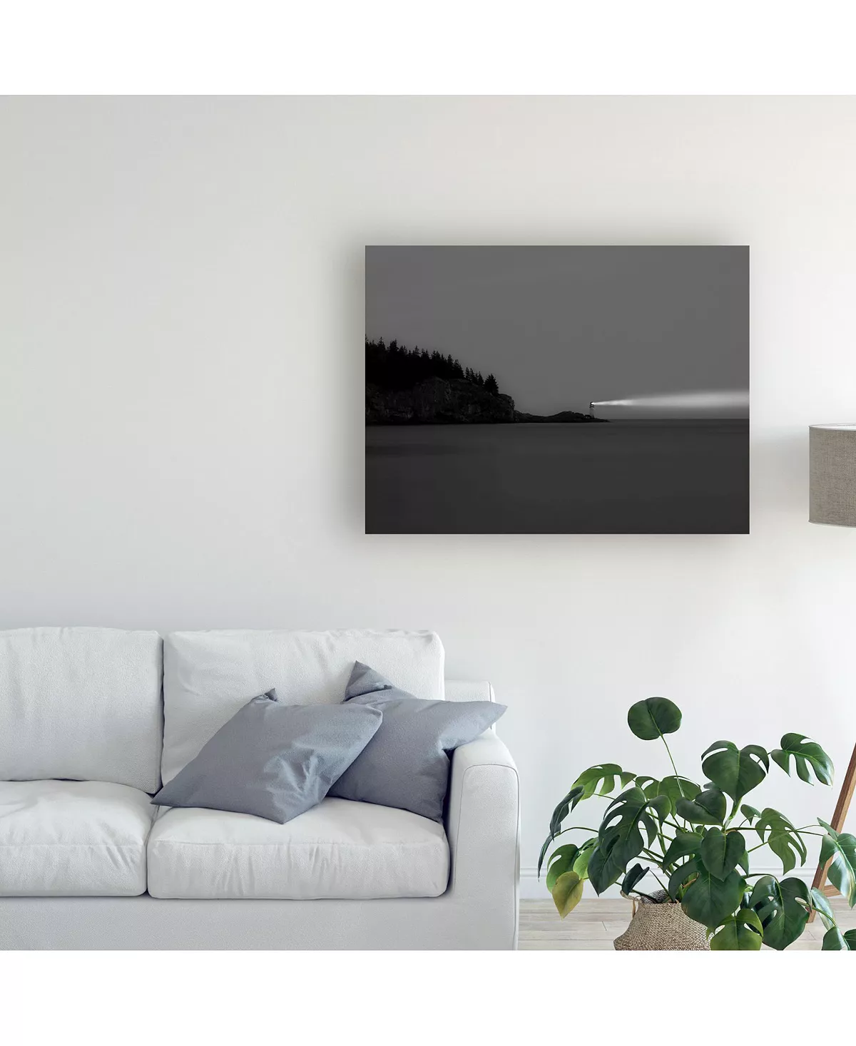 This ready to hang, gallery-wrapped art piece features a lighthouse in the distance of a coastline. Gallery-wrap is a method of wrapping an artist’s canvas around a hidden, wooden frame allowing for a frameless presentation.