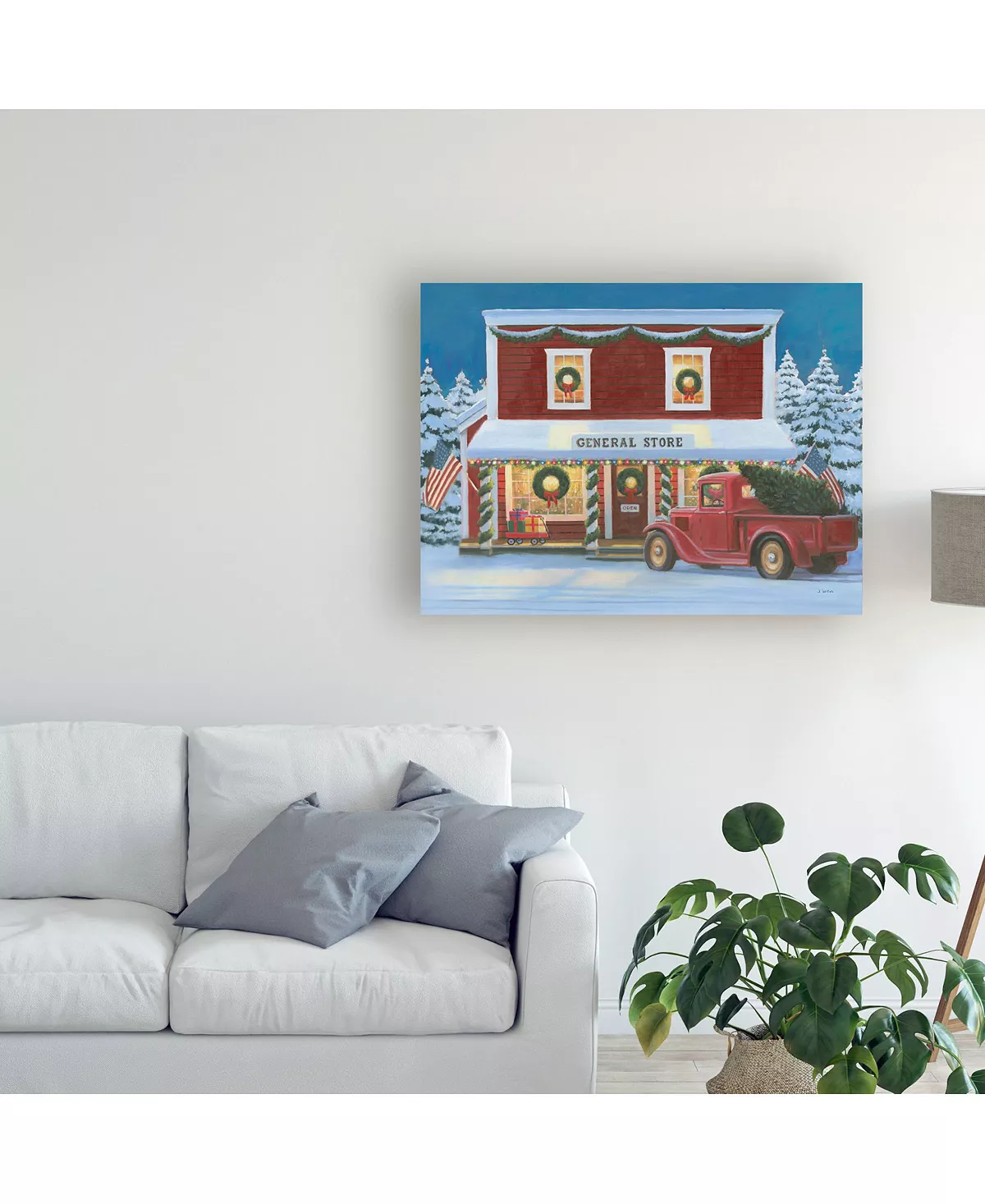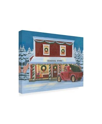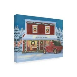 This ready to hang, gallery-wrapped art piece features a vintage red truck parked in front of a snowy general store with Christmas decorations. This art is gallery-wrapped, which allows for a frameless presentation.