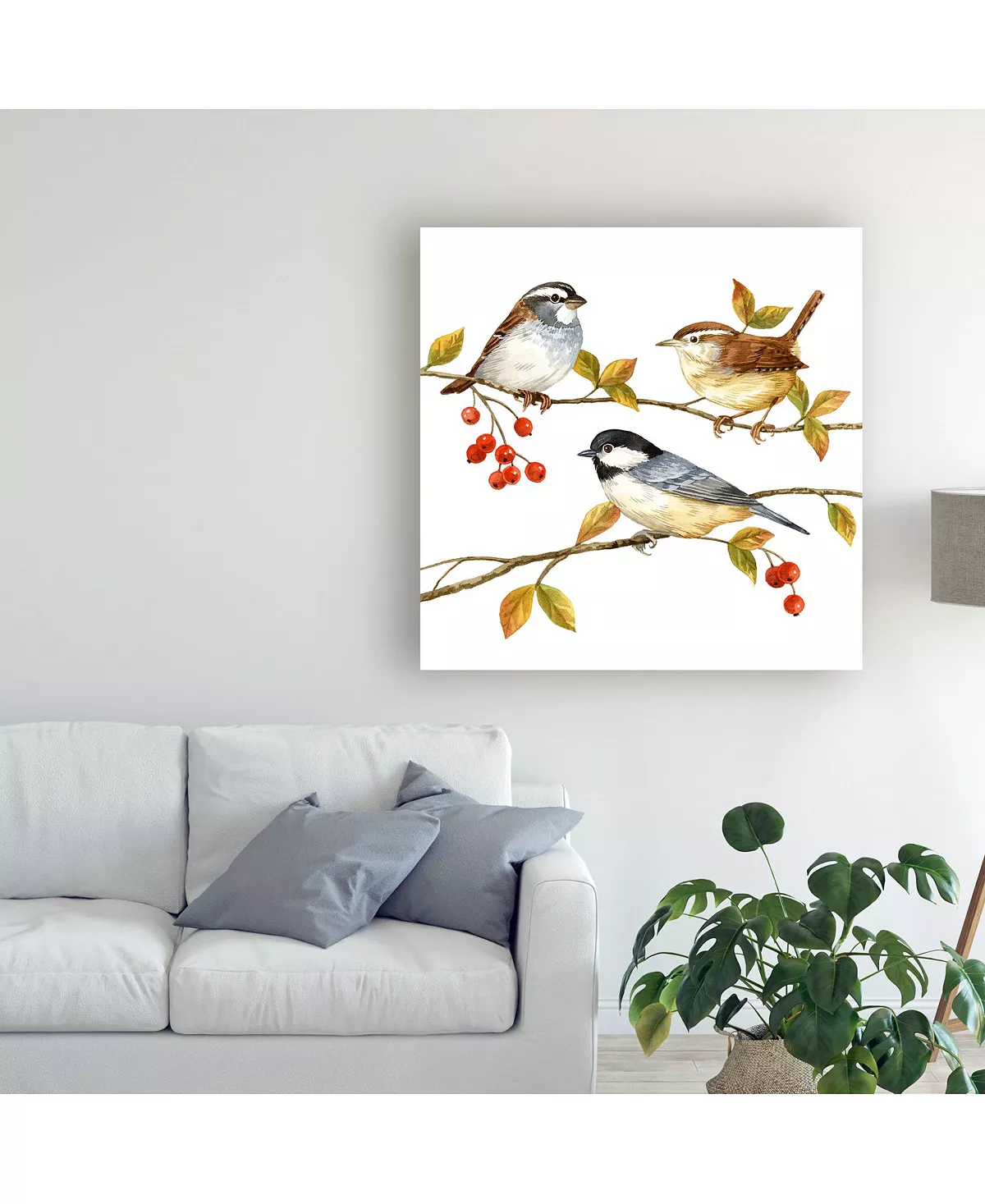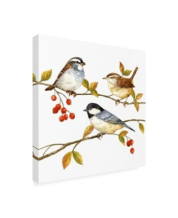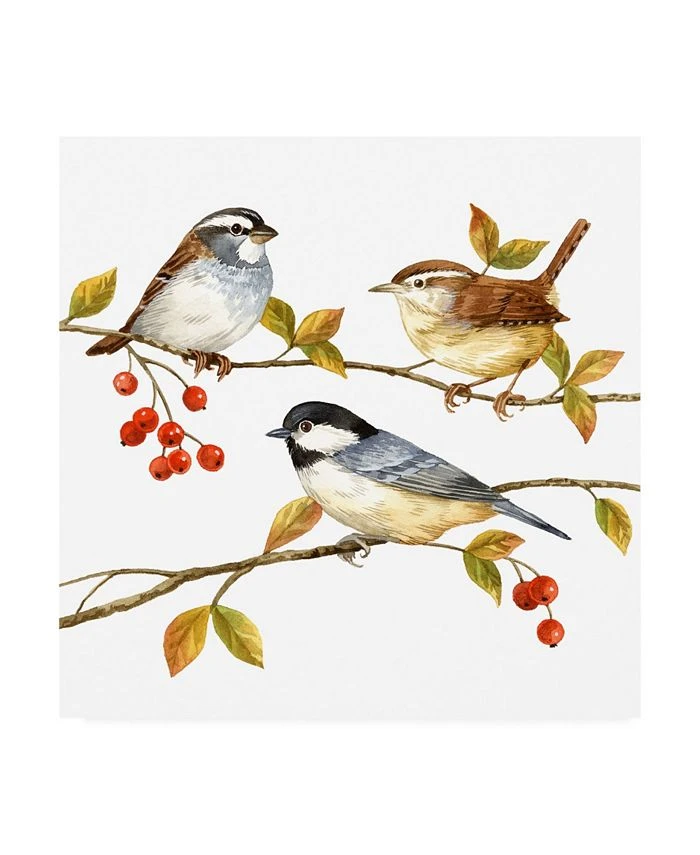 This ready to hang, gallery-wrapped art piece features three small birds sitting on a tree branch over white. Gallery-wrap is a method of wrapping an artist’s canvas around a hidden, wooden frame allowing for a frameless presentation.