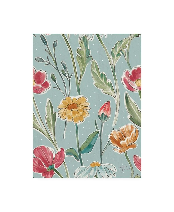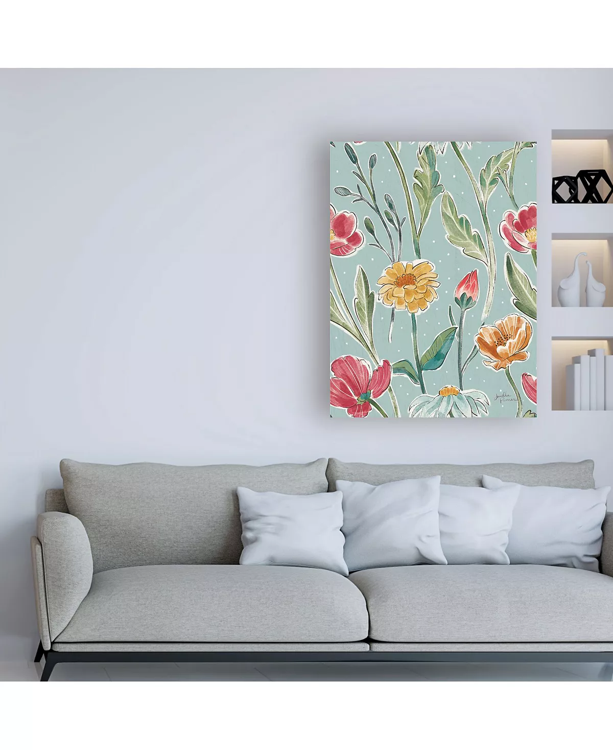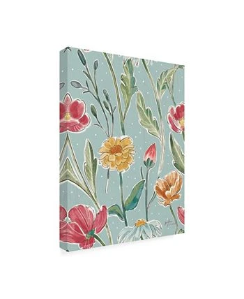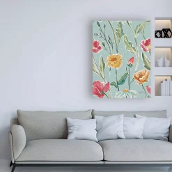This ready to hang, gallery-wrapped art piece features yellow and pink flowers over a blue background. Gallery-wrap is a method of wrapping an artist’s canvas around a hidden, wooden frame allowing for a frameless presentation.