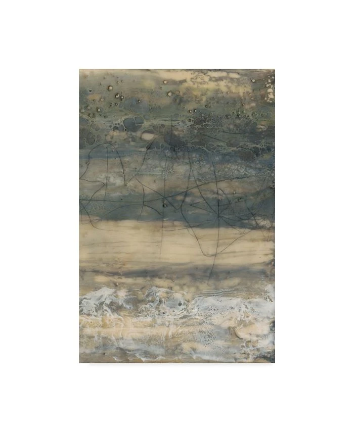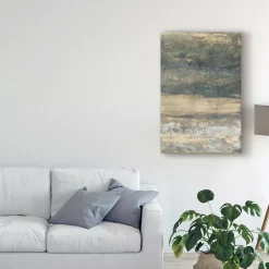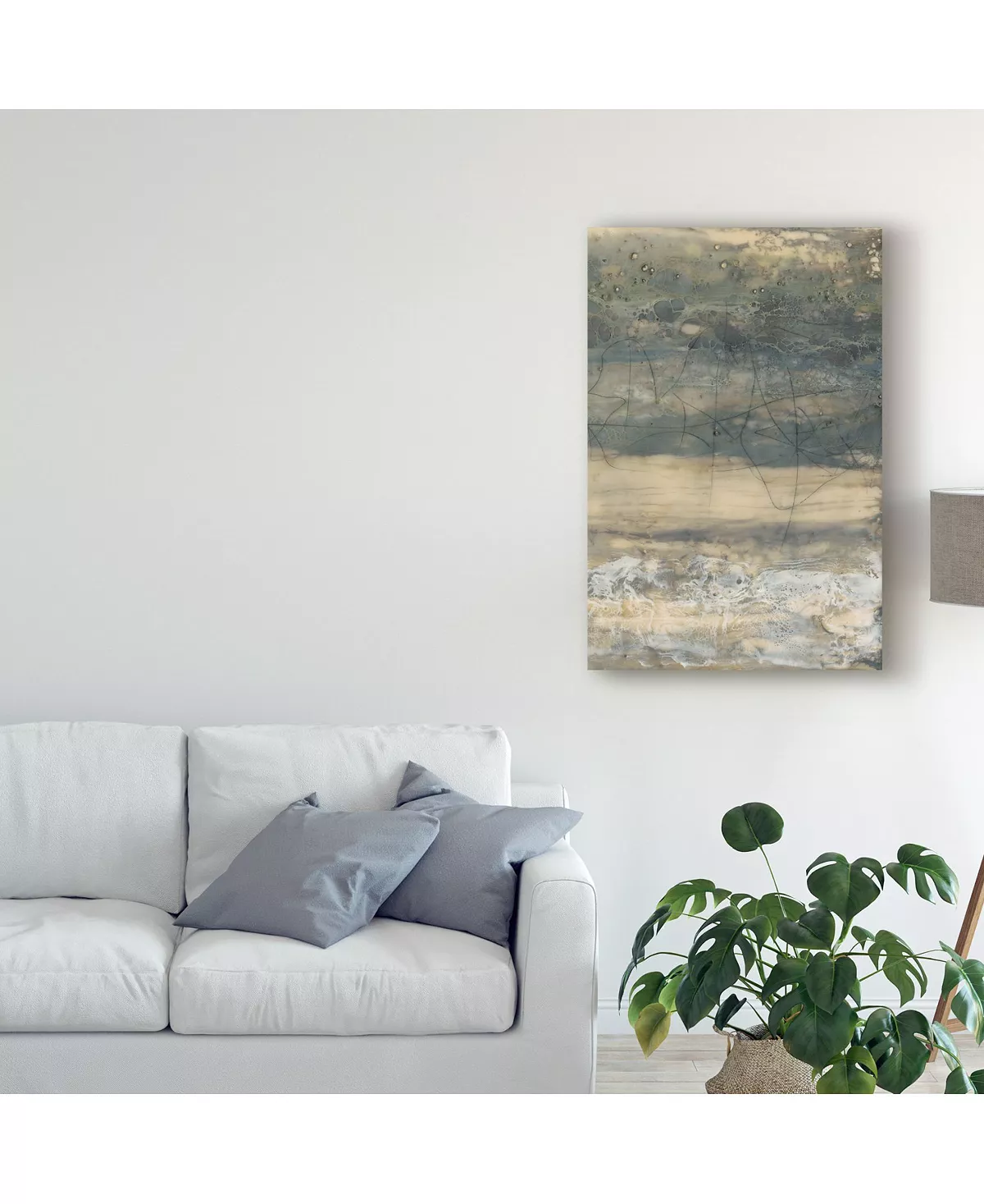 This ready to hang, gallery-wrapped art piece features gray and beige abstract paint filling the frame. Gallery-wrap is a method of wrapping an artist’s canvas around a hidden, wooden frame allowing for a frameless presentation.