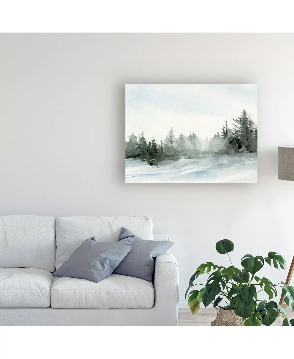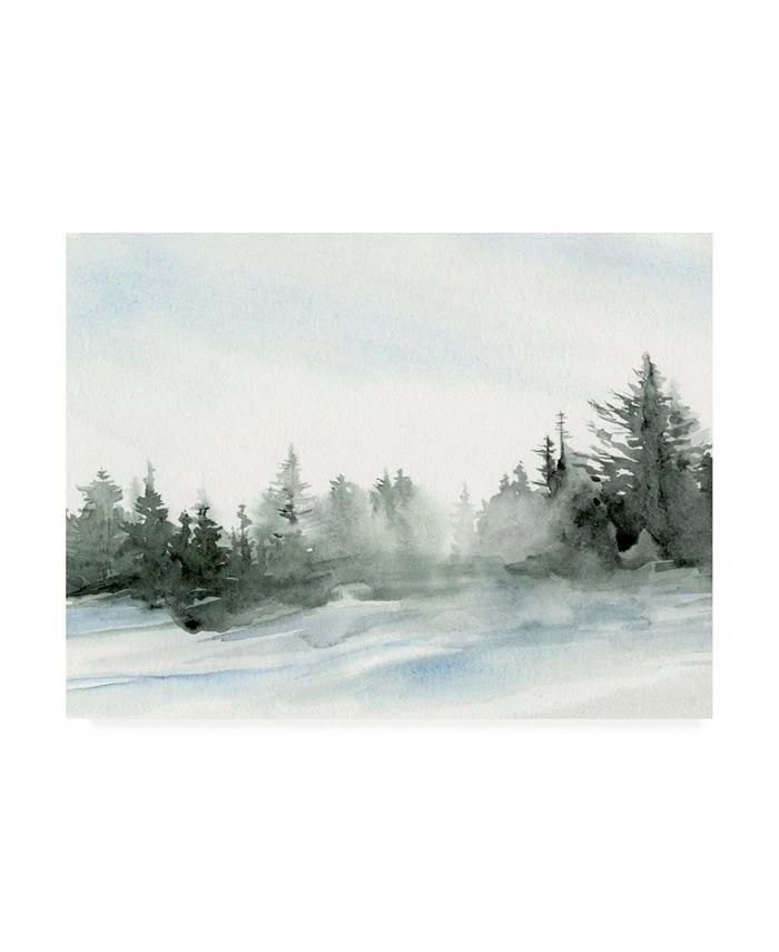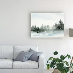 This ready to hang, gallery-wrapped art piece features a dark forest in the center of a winter landscape. Gallery-wrap is a method of wrapping an artist’s canvas around a hidden, wooden frame allowing for a frameless presentation.
