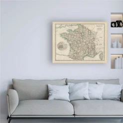 This ready to hang, gallery-wrapped art piece features a traditional map of France in beige. Gallery-wrap is a method of wrapping an artist’s canvas around a hidden, wooden frame allowing for a frameless presentation.