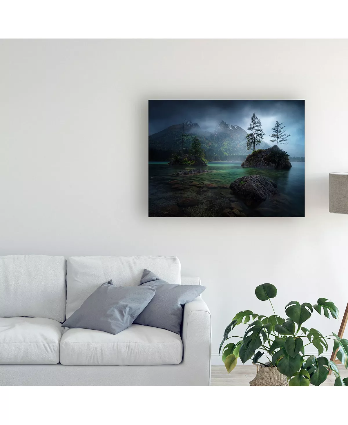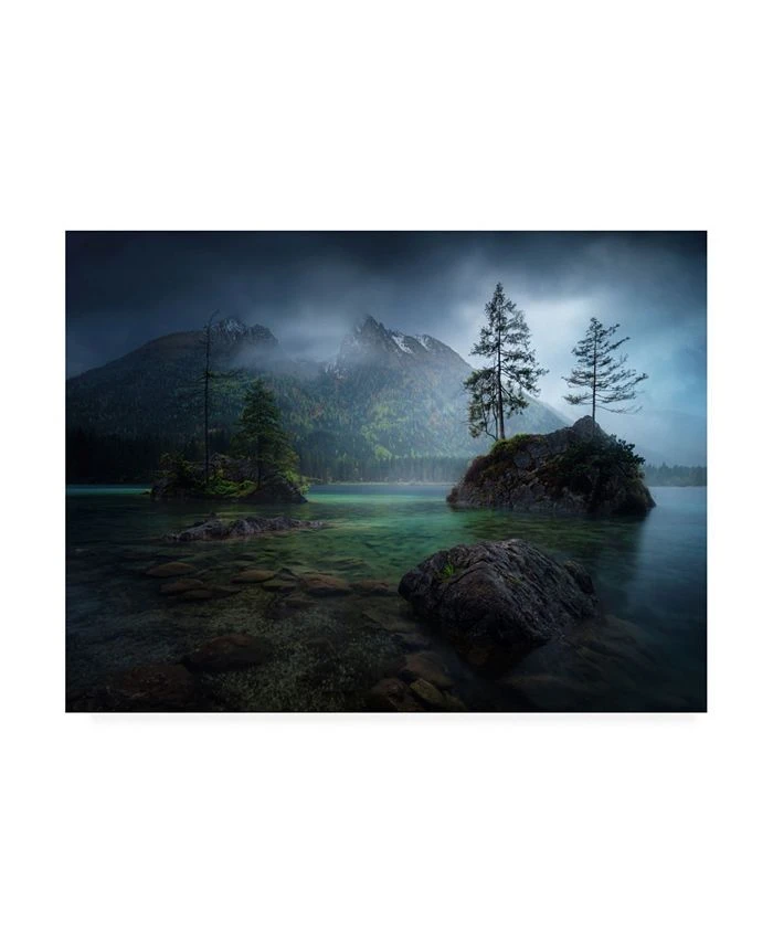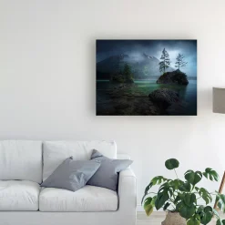 This ready to hang, gallery-wrapped art piece features a mountain landscape under a dark sky. Gallery-wrap is a method of wrapping an artist’s canvas around a hidden, wooden frame allowing for a frameless presentation.
