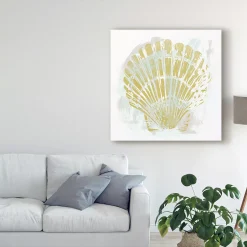 This ready to hang, gallery-wrapped art piece features a gold shell in the center of the frame. Gallery-wrap is a method of wrapping an artist’s canvas around a hidden, wooden frame allowing for a frameless presentation.