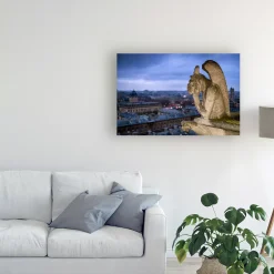 This ready to hang, gallery-wrapped art piece features a gargoyle on the right side of a cityscape. Gallery-wrap is a method of wrapping an artist’s canvas around a hidden, wooden frame allowing for a frameless presentation.