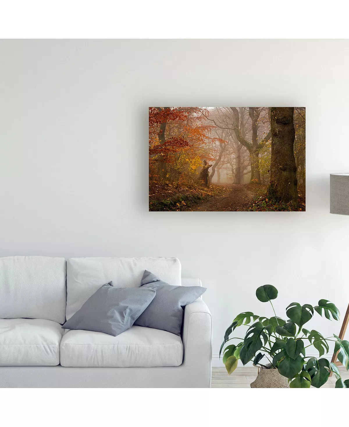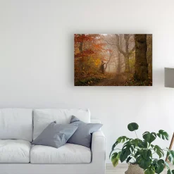 This ready to hang, gallery-wrapped art piece features a path running down the center of an autumn forest. Gallery-wrap is a method of wrapping an artist’s canvas around a hidden, wooden frame allowing for a frameless presentation.