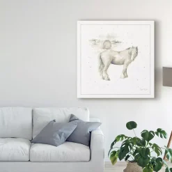 This ready to hang, gallery-wrapped art piece features a grey ink sketch of a horse in front of rolls of hay. Gallery-wrap is a method of wrapping an artist’s canvas around a hidden, wooden frame allowing for a frameless presentation.