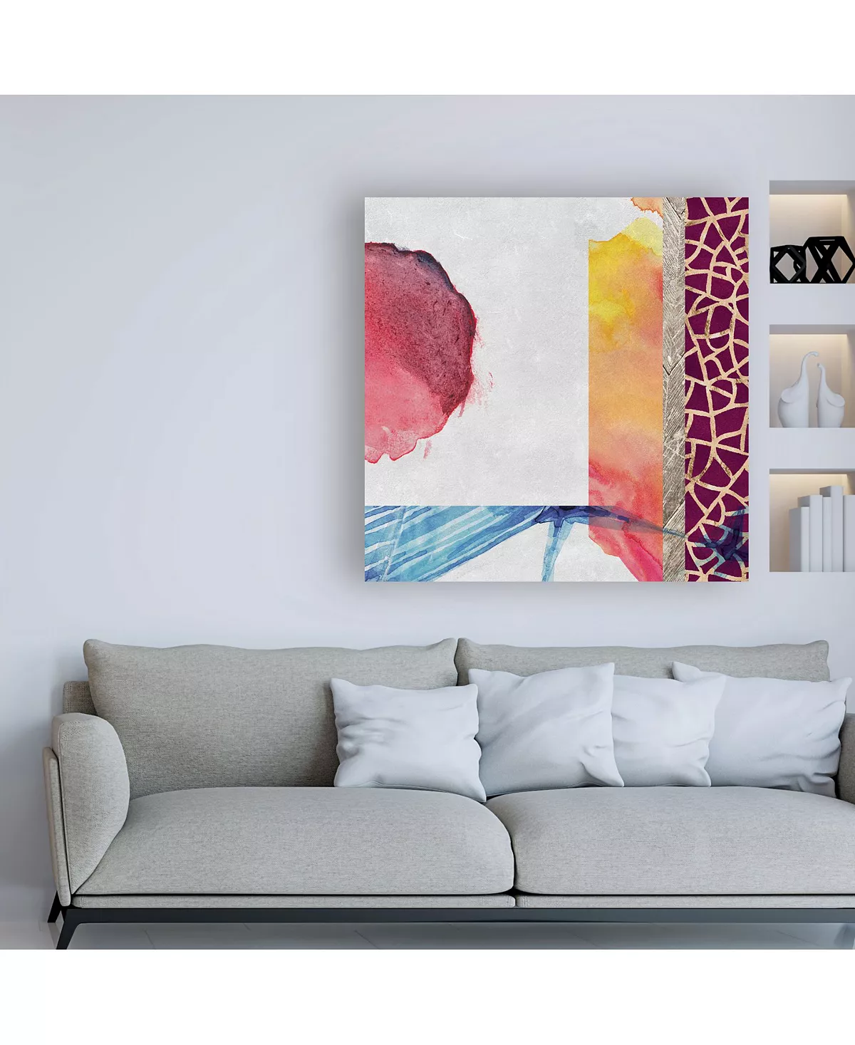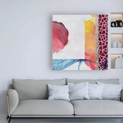 This ready to hang, gallery-wrapped art piece features red and orange ink bleeding onto a distressed background. Gallery-wrap is a method of wrapping an artist’s canvas around a hidden, wooden frame allowing for a frameless presentation.