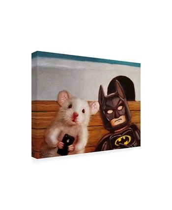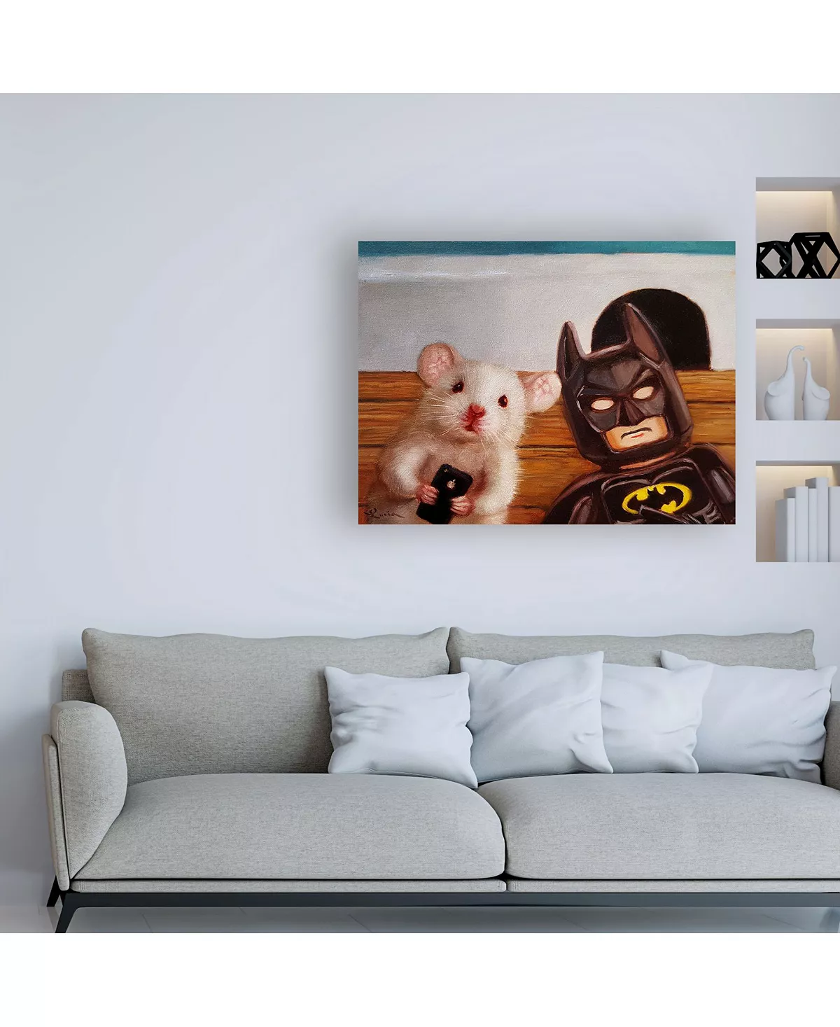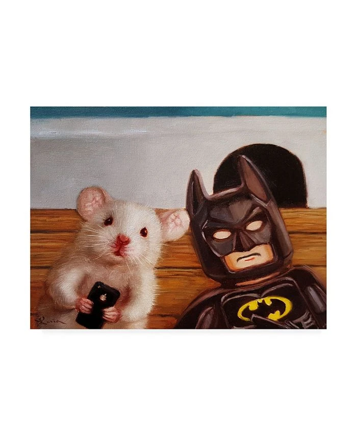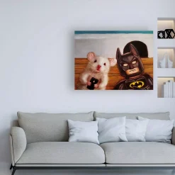 This ready to hang, gallery-wrapped art piece features a mouse and a character sitting in front of a hole in the wall. Gallery-wrap is a method of wrapping an artist’s canvas around a hidden, wooden frame allowing for a frameless presentation.