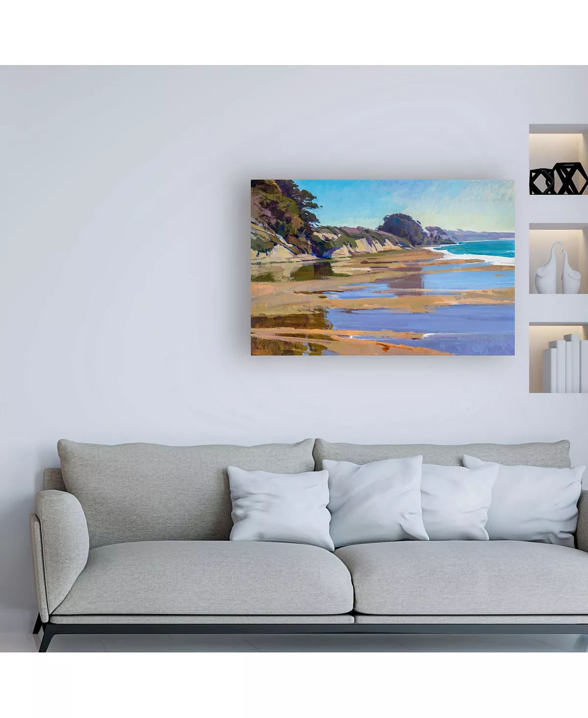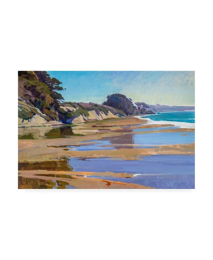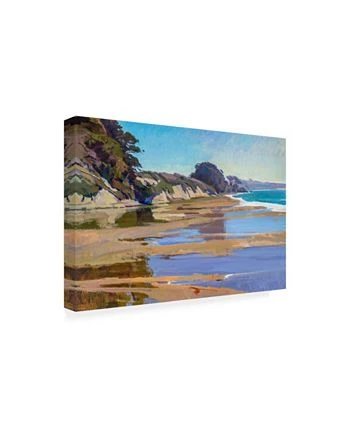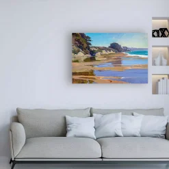 This ready to hang, gallery-wrapped art piece features a painting of a coastline at high tide in the fall. Gallery-wrap is a method of wrapping an artist’s canvas around a hidden, wooden frame allowing for a frameless presentation.