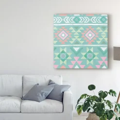 This ready to hang, gallery-wrapped art piece features a geometric Southwestern pattern in shades of green, teal, white and pink. Gallery-wrap is a method of wrapping an artist’s canvas around a hidden, wooden frame allowing for a frameless presentation.