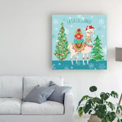 This ready to hang, gallery-wrapped art piece features a llama in a Santa hat carrying a stack of wrapped gifts. Gallery-wrap is a method of wrapping an artist’s canvas around a hidden, wooden frame allowing for a frameless presentation.