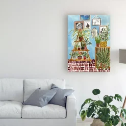 This ready to hang, gallery-wrapped art piece features a blue room full of green plants. Gallery-wrap is a method of wrapping an artist’s canvas around a hidden, wooden frame allowing for a frameless presentation.