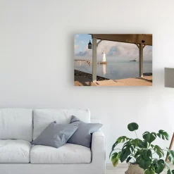This ready to hang, gallery-wrapped art piece features a white lighthouse in the distance. Gallery-wrap is a method of wrapping an artist’s canvas around a hidden, wooden frame allowing for a frameless presentation.