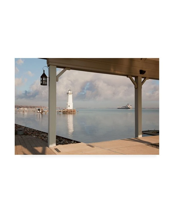 This ready to hang, gallery-wrapped art piece features a white lighthouse in the distance. Gallery-wrap is a method of wrapping an artist’s canvas around a hidden, wooden frame allowing for a frameless presentation.