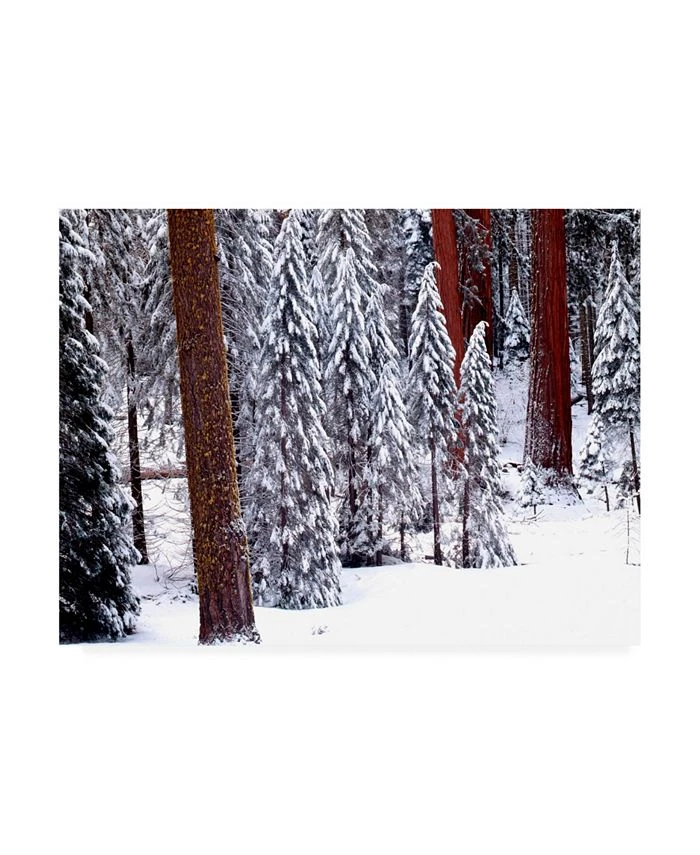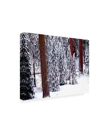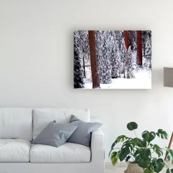 This ready to hang, gallery-wrapped art piece features trees in a forest covered in snow. Gallery-wrap is a method of wrapping an artist’s canvas around a hidden, wooden frame allowing for a frameless presentation.