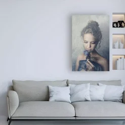 This ready to hang, gallery-wrapped art piece features a portrait of a woman with a blue flower. Gallery-wrap is a method of wrapping an artist’s canvas around a hidden, wooden frame allowing for a frameless presentation.