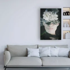 This ready to hang, gallery-wrapped art piece features a portrait of a woman with white flowers over her face. Gallery-wrap is a method of wrapping an artist’s canvas around a hidden, wooden frame allowing for a frameless presentation.