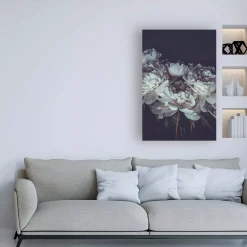 This ready to hang, gallery-wrapped art piece features white flowers over a dark background. Gallery-wrap is a method of wrapping an artist’s canvas around a hidden, wooden frame allowing for a frameless presentation.