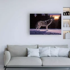This ready to hang, gallery-wrapped art piece features a wolf standing in the center of the frame. Gallery-wrap is a method of wrapping an artist’s canvas around a hidden, wooden frame allowing for a frameless presentation.