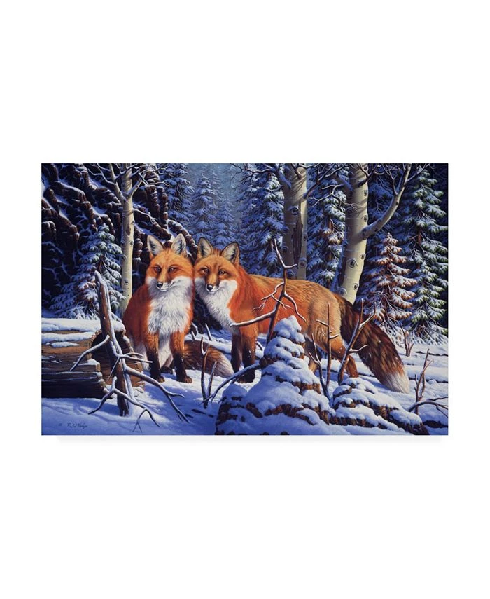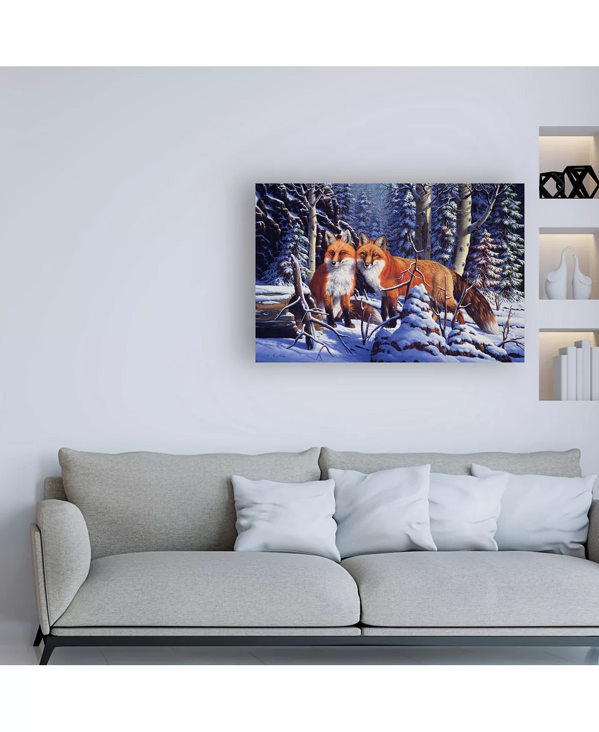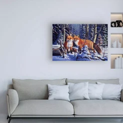 This ready to hang, gallery-wrapped art piece features two foxes in the center of the frame. Gallery-wrap is a method of wrapping an artist’s canvas around a hidden, wooden frame allowing for a frameless presentation.