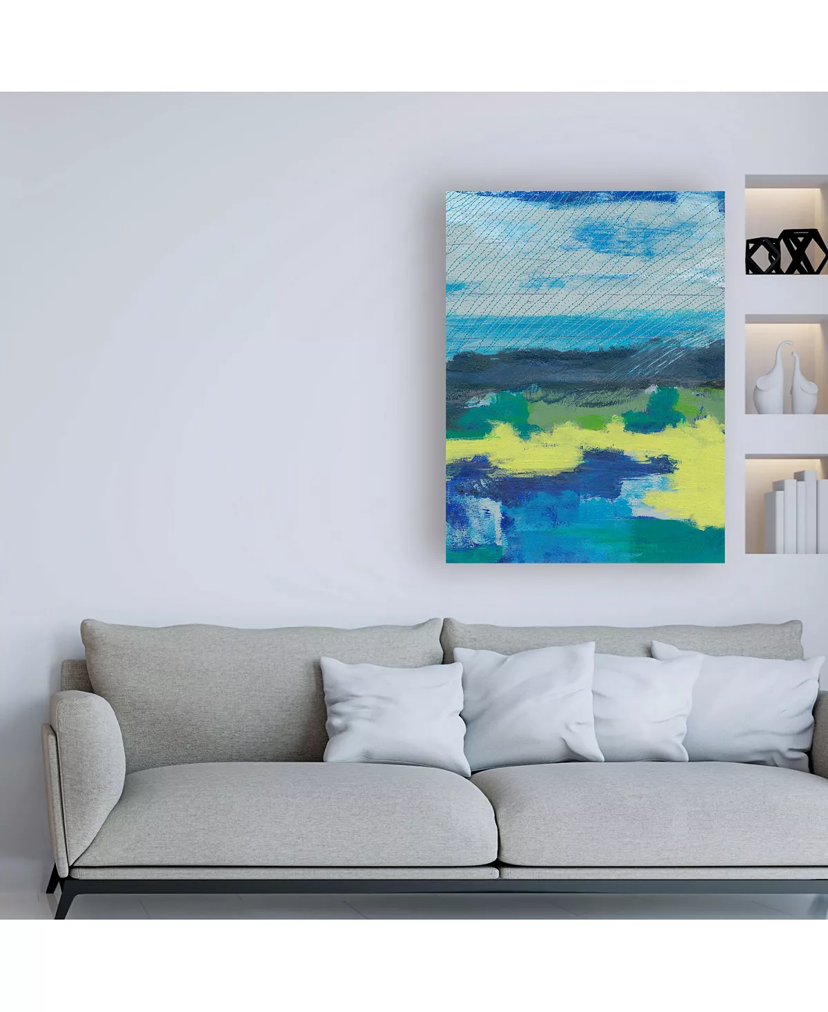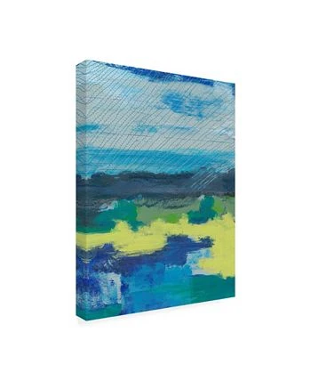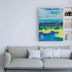 This ready to hang, gallery-wrapped art piece features an abstract skyline in shades of blue. Gallery-wrap is a method of wrapping an artist’s canvas around a hidden, wooden frame allowing for a frameless presentation.