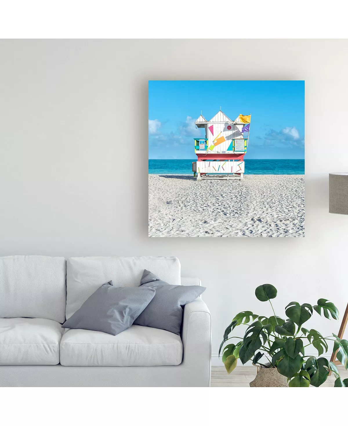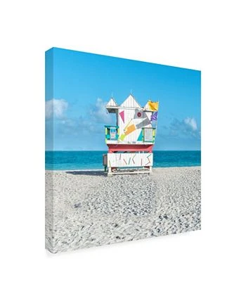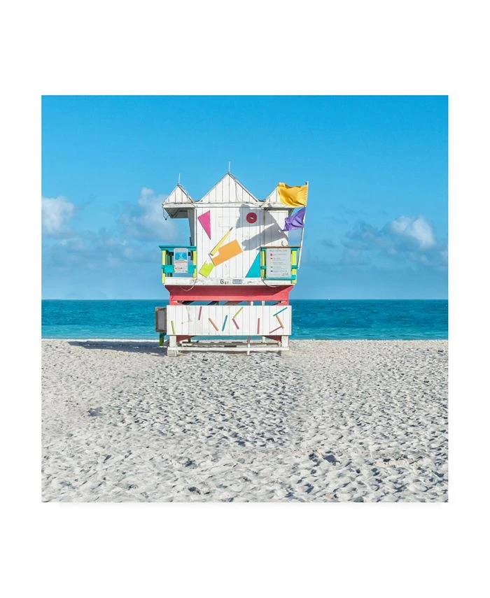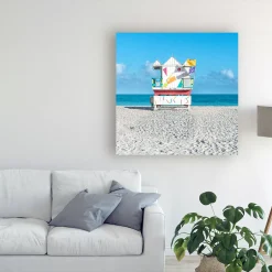 This ready to hang, gallery-wrapped art piece features a lifeguard stand in the center of a coastline. Gallery-wrap is a method of wrapping an artist’s canvas around a hidden, wooden frame allowing for a frameless presentation.