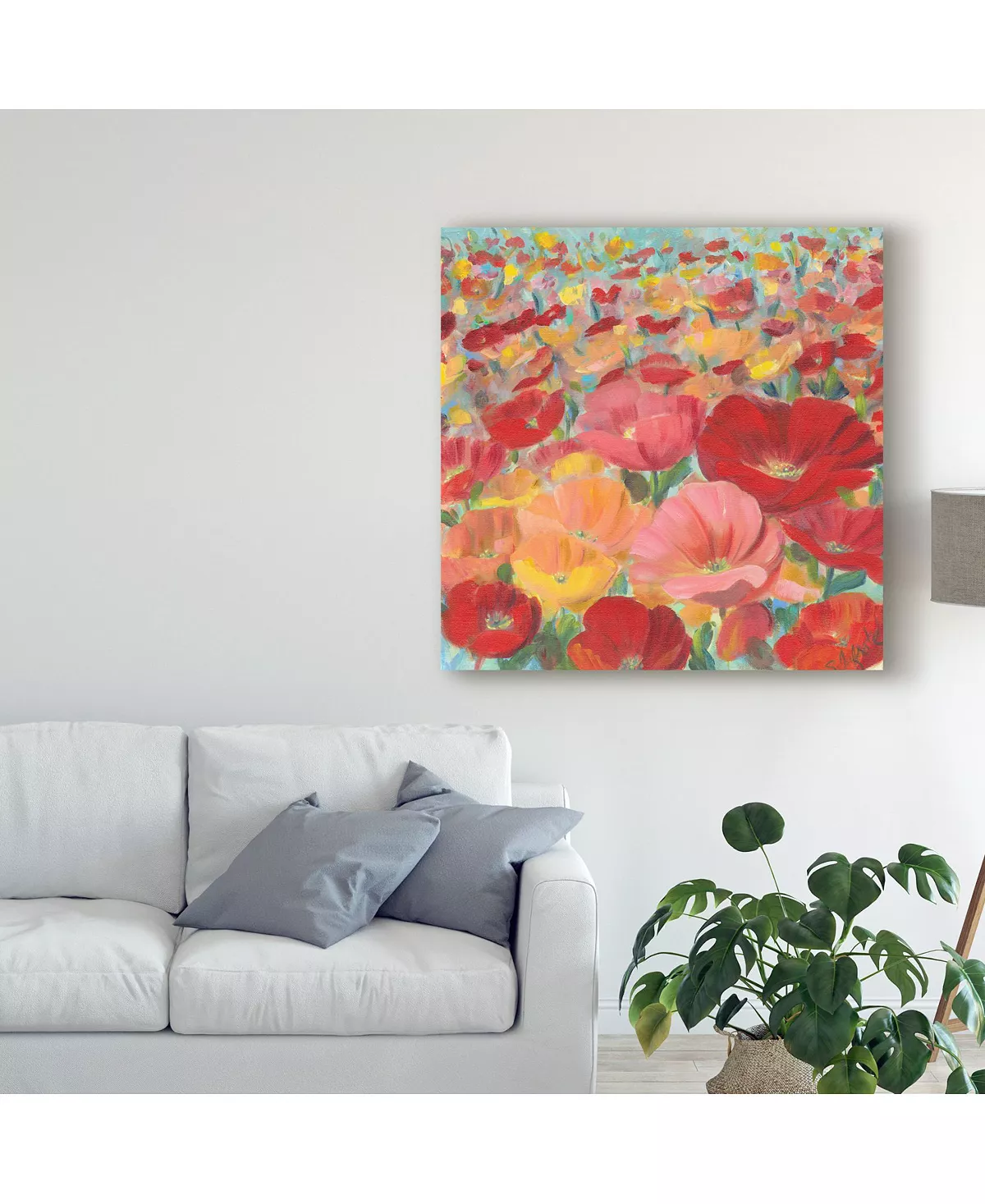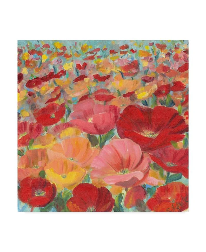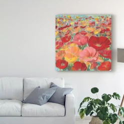 This ready to hang, gallery-wrapped art piece features red flowers filling the frame. Gallery-wrap is a method of wrapping an artist’s canvas around a hidden, wooden frame allowing for a frameless presentation.