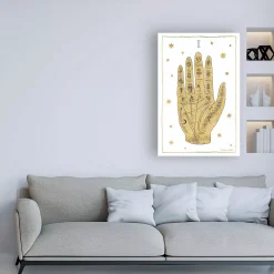 This ready to hang, gallery-wrapped art piece features a fortune teller hand with astrology symbols. Gallery-wrap is a method of wrapping an artist’s canvas around a hidden, wooden frame allowing for a frameless presentation.