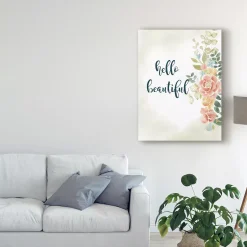 This ready to hang, gallery-wrapped art piece features typography with pink flowers next to it. Gallery-wrap is a method of wrapping an artist’s canvas around a hidden, wooden frame allowing for a frameless presentation.