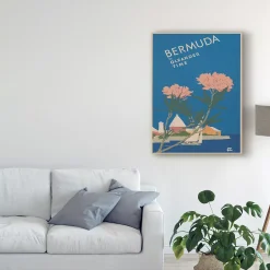 This ready to hang, gallery-wrapped art piece features two pink flowers over a coastal landscape. Gallery-wrap is a method of wrapping an artist’s canvas around a hidden, wooden frame allowing for a frameless presentation.