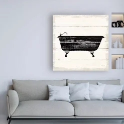 This ready to hang, gallery-wrapped art piece features a black vintage bathtub against ivory shiplap Gallery-wrap is a method of wrapping an artist’s canvas around a hidden, wooden frame allowing for a frameless presentation.