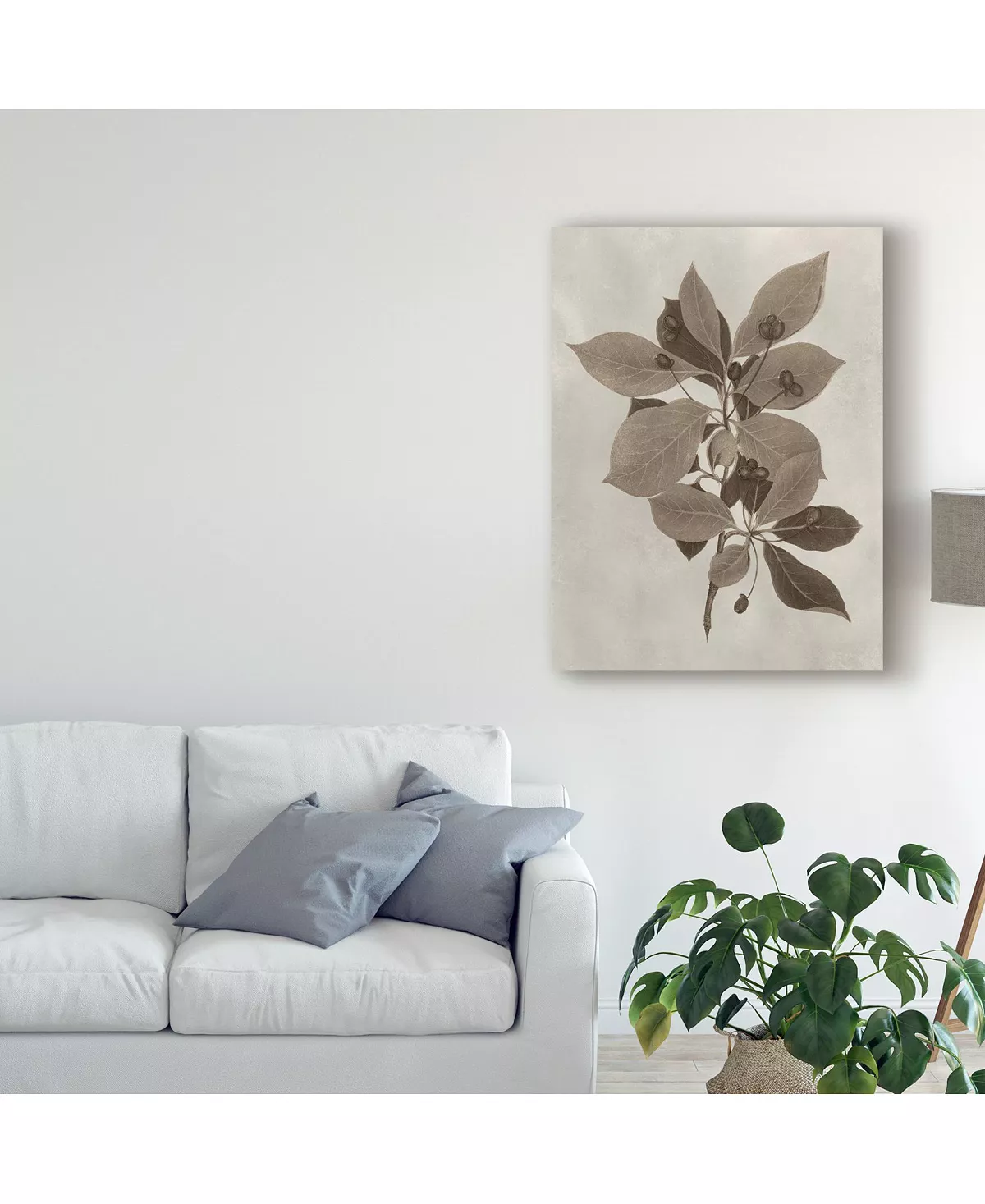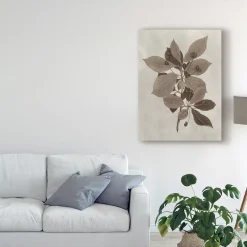 This ready to hang, gallery-wrapped art piece features gray arbor leaves over a light background. Gallery-wrap is a method of wrapping an artist’s canvas around a hidden, wooden frame allowing for a frameless presentation.